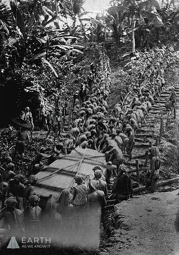 La Cultura Nias de Indonesia, arrastrando un megalito cuesta arriba con cuerdas. Schroeder, E. E. W. Gs. (1917) Nias: Ethnographische, geographische en historische aanteekeningen en studien.