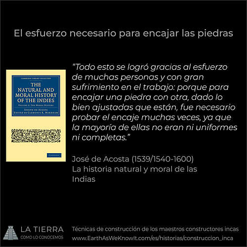 Una cita del cronista José de Acosta, que describe el esfuerzo requerido para ajustar las piedras en la construcción incaica.