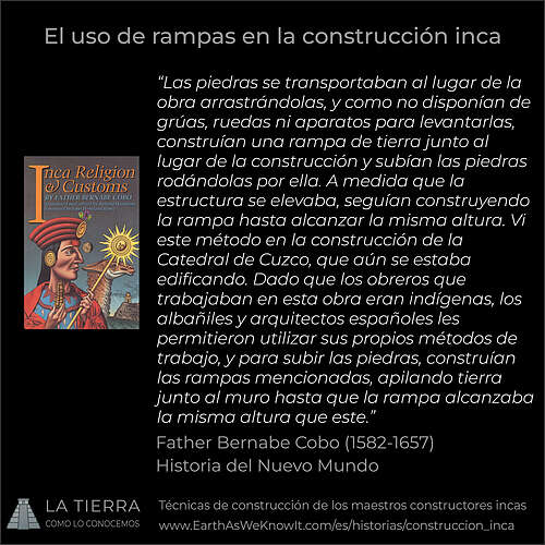 Una cita del cronista español Padre Benabe Cobo, que describe el uso de rampas en la construcción inca.