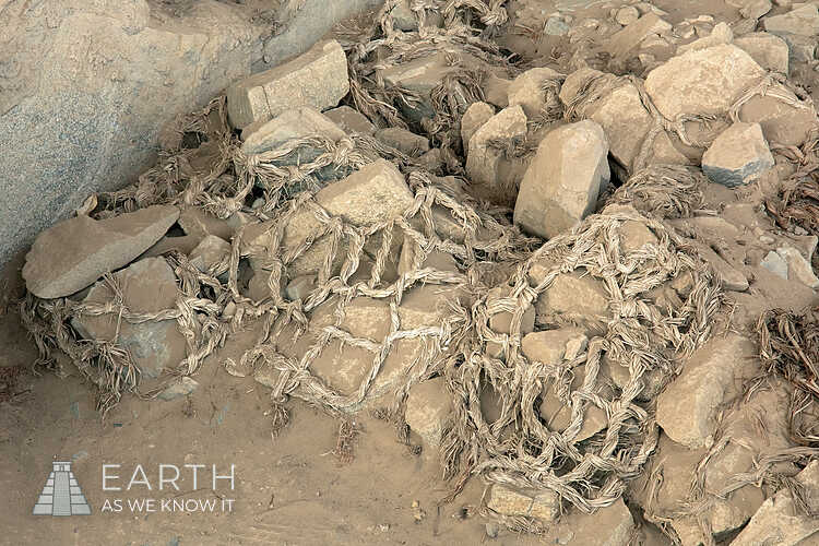 Fardos de piedra atados con cuerda, utilizados en la construcción de la antigua ciudad de Caral y otras pirámides de la cultura Caral-Supe.