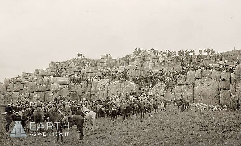 Una foto de Sacsayhuamán tomada a principios de 1900, que muestra que las paredes de contención superiores de menor calidad aún no se han construido. Esta evidencia contradice la narrativa de la historia alternativa que afirma que los incas solo construyeron esas paredes superiores.