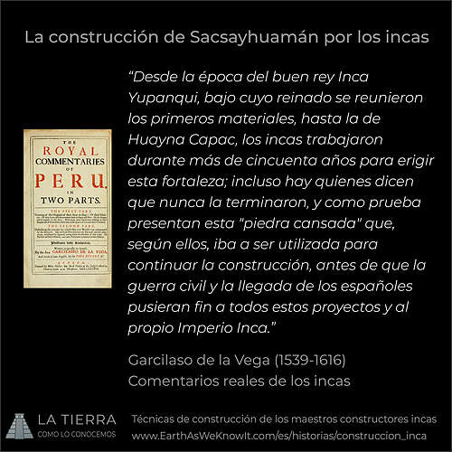 Una cita del cronista español "El Inca" Garcilaso de la Vega, que describe la construcción de Sacsayhuamán durante el reinado de Pachacútec y sus sucesores.
