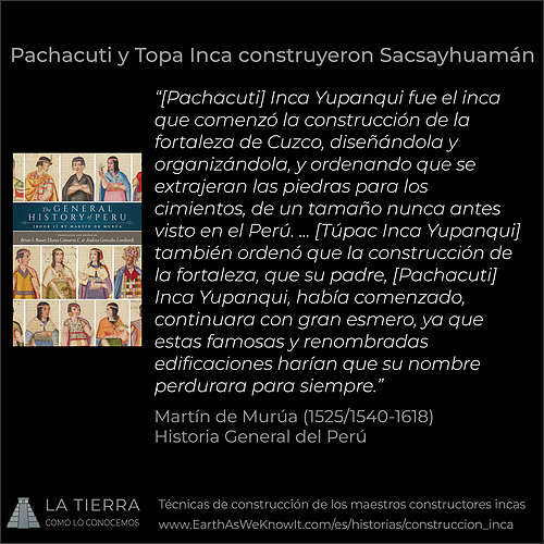 Una cita del cronista español Martín de Murúa, que describe cómo Sacsayhuaman fue construido por Pachacuti y su hijo, Topa Inca.