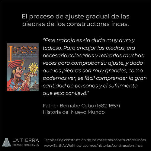 Una cita del cronista español Padre Benabe Cobo, que describe el proceso incremental de ajuste de piedras utilizado por los albañiles incas.
