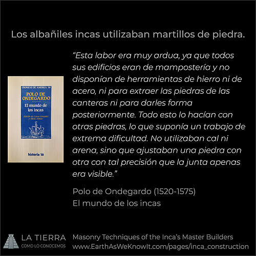 Una cita del cronista español Polo de Ondegardo, que describe el uso de martillos de piedra por parte de los albañiles incas.