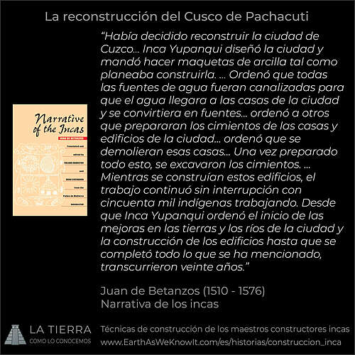 Una cita del cronista Juan de Betanzos, que describe cómo el emperador inca Pachacútec construyó la ciudad de Cusco utilizando miles de trabajadores.