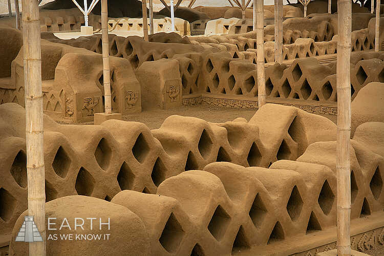 In their worldview, silver represented the light of the moon, associated with the ocean and tides, whereas gold represented the sun, tied to the seasons and agriculture. Before their later imperial period, severe El Niño flooding stripped farmland of topsoil and causing widespread famine. After this collapse, marine motifs became more common in Chimú architecture, perhaps signaling a growing importance of seafood. Pelicans signified the presence of baitfish, while the citadel’s mesh-like walls are stylized as fishing nets. Squirrels around the main temple are said to represent the hoarding of food, which would be distributed throughout their empire in times of crop failure.
