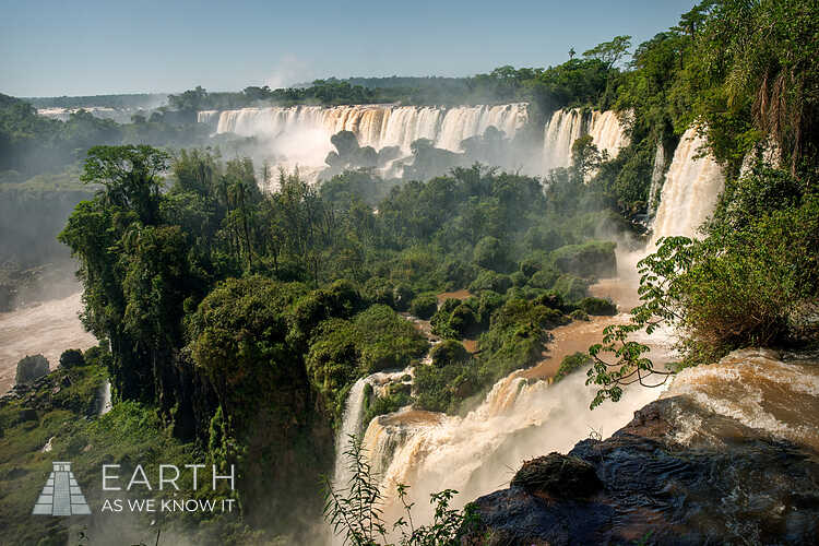 A view from the southern side of the massive Iguazú Falls (Iguaçu Falls), situated on the border between Argentina and Brazil.