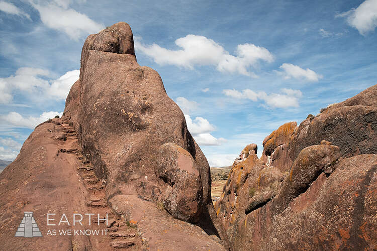 Although the carved "gateway" is the most famous feature of this site, continuing to climb the stairs beyond it will lead you up through the site's unique geology, passing vertical sandstone slabs, echoing canyons, and eventually to a high mountain overlooking Lake Titacaca and the distant Andes. While I was exploring back here, I came across some fresh mountain lion scat, and then some tracks. It looked like good habitat for them to ambush prey, like the Viscacha that live around there.