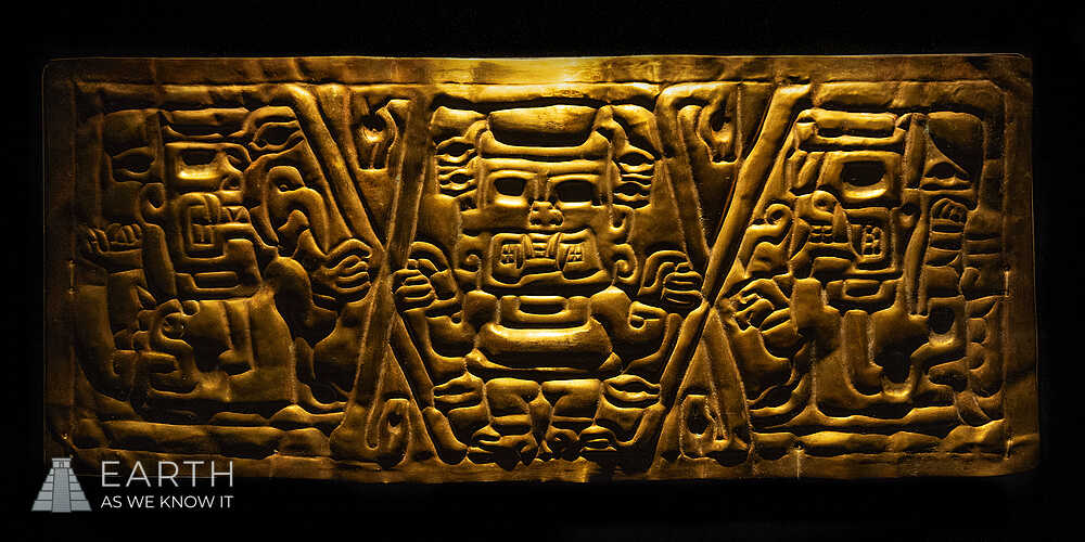 A gold funerary offering in the style of the Chavín religion, depicting the Staff God. These are flanked by two eagle deities, similar to the steeles on the columns of the Chavín de Huantar temple. The location that this was from is uncertain, but according to the archeologist John Holand Rowe, it is believed to have been discovered in the Lambeyeque Valley. Other similar Chavín style gold crowns were also found on Peru's north coast associated with the Cupisnique culture.