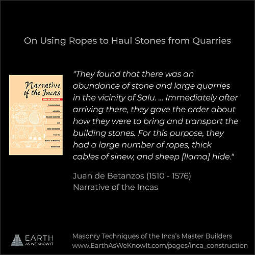 A quote by the chronicler Juan de Betanzos, describing the use of ropes to haul stones during Inca construction.