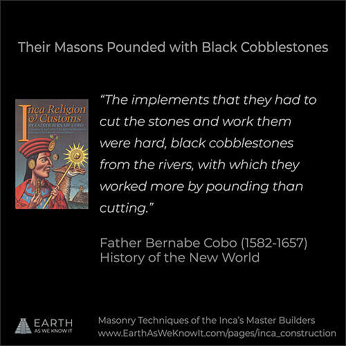 A quote by the Spanish chronicler Father Benabe Cobo, detailing how the Inca era stonemasons shaped the rock with black cobblestones.