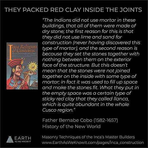 A quote by the Spanish chronicler Father Benabe Cobo explaining how the insides of joints were packed with a red clay, which they called llàncac allpa.