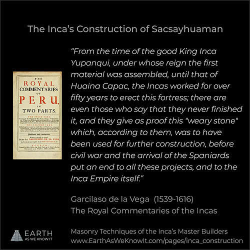 A quote by the Spanish chronicler Garcilaso de la Vega, describing the construction of Sacsayhuaman during the reign of Pachacuti and his successors.