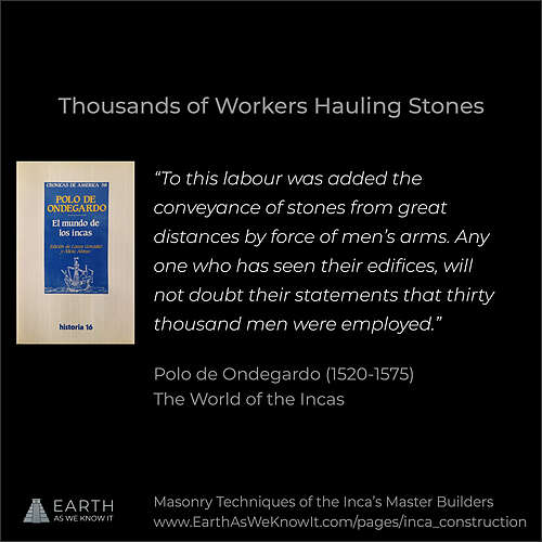 A quote by the chronicler Polo de Ondegardo, describing how thousands of workers hauled stones during Inca construction.