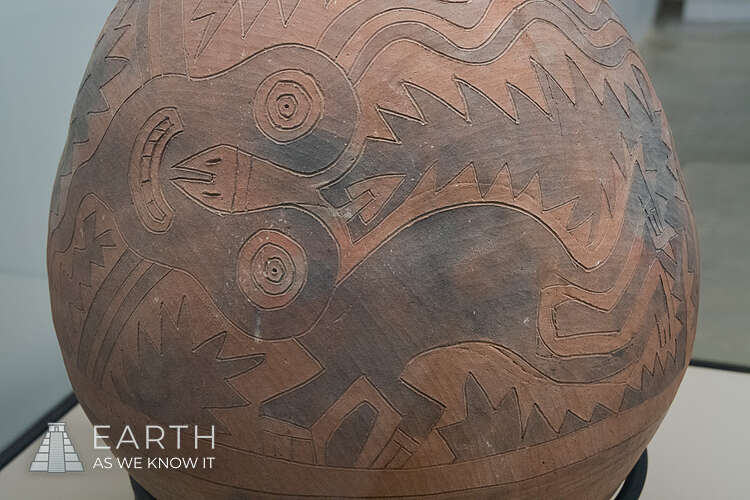 The Oculate Being is a common motif found in Paracas culture textiles and ceramics. Believed to represent a deity associated with fertility and agriculture, the figure is characterized by its large, round eyes and intricate designs. Located at Museo Arqueológico Julio C. Tello, Paracas.